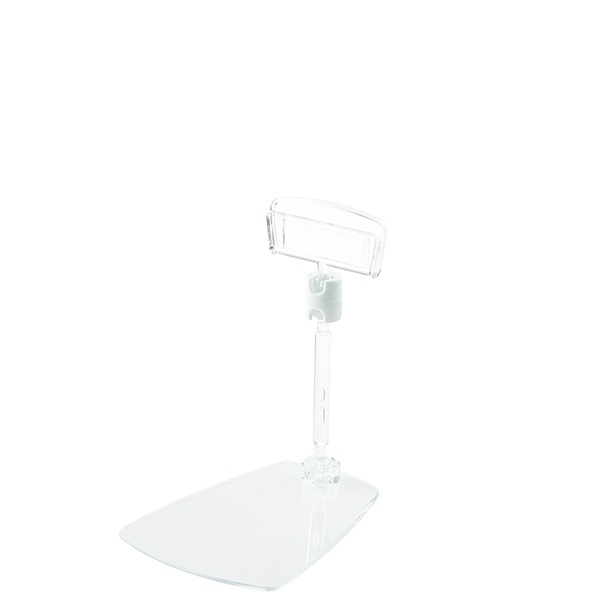 Шарнирный ценникодержатель на прямоугольной подставке. Удлиненная подставка удобна для использования ценникодержателя в отделе «Гастрономия». Шарнирные соединения обеспечивают максимальную гибкость использования.