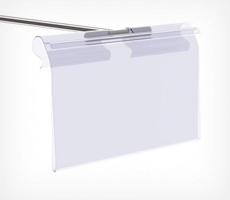 Подвешивается на T-образные одинарные или двойные металлические крючки. При снимании товара с крючка откидывается вверх, затем возвращается в исходное положение. Высота ценникодержателя 39 мм.