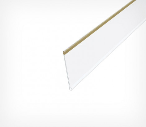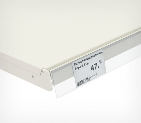 Крепится на передний край полки с помощью прозрачного двухстороннего скотча.