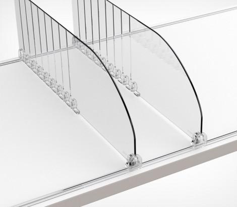 Разделитель DIV30-B выс.30 мм без огран.185-385 мм - предназначен для организации выкладки небольших лёгких товаров, таких как сигареты, лекарства, парфюмерия и косметика. материал: прозрачный ударопрочный пластик, имеет насечки с шагом 25 мм для обламывания по длине. Особенности: подходит для полок глубиной 200–400 мм. Задняя часть разделителя разделена на фрагменты, которые можно отрезать, чтобы регулировать длину. Для крепления на полку нужны специальные профили, которые фиксируются на переднюю и заднюю стороны полки. На передней и задней части разделителя есть вырезы (замки) для фиксации на профиль.